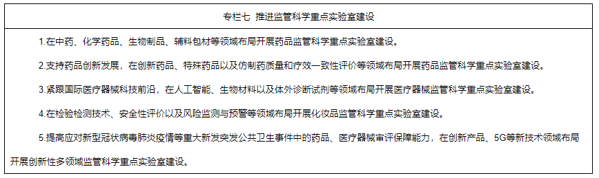 6.深入實(shí)施中國藥品監(jiān)管科學(xué)行動(dòng)計(jì)劃。統(tǒng)籌推進(jìn)監(jiān)管科學(xué)研究基地和重點(diǎn)實(shí)驗(yàn)室建設(shè),開展監(jiān)管科學(xué)等研究。將藥品監(jiān)管科學(xué)研究納入國家相關(guān)科技計(jì)劃,重點(diǎn)支持中藥、疫苗、基因藥物、細(xì)胞藥物、人工智能醫(yī)療器械、醫(yī)療器械新材料、化妝品新原料等領(lǐng)域的監(jiān)管科學(xué)研究,加快新產(chǎn)品研發(fā)上市。支持國家審評、檢驗(yàn)、評價(jià)、核查等機(jī)構(gòu)參與國家相關(guān)科技項(xiàng)目,鼓勵(lì)開展藥品快速檢測新技術(shù)、藥品研發(fā)生產(chǎn)及質(zhì)量控制等研究,開展數(shù)字診療裝備、個(gè)體化診療產(chǎn)品、生物醫(yī)用材料的質(zhì)量評價(jià)、檢測技術(shù)及檢測規(guī)范等研究,開展化學(xué)藥品、疫苗、新型藥物和特殊藥物劑型等安全性、有效性評價(jià)技術(shù)以及創(chuàng)新醫(yī)療器械標(biāo)準(zhǔn)體系研究。鼓勵(lì)運(yùn)用現(xiàn)代科學(xué)技術(shù),結(jié)合我國傳統(tǒng)優(yōu)勢項(xiàng)目和特色植物資源,加強(qiáng)化妝品新原料研究。